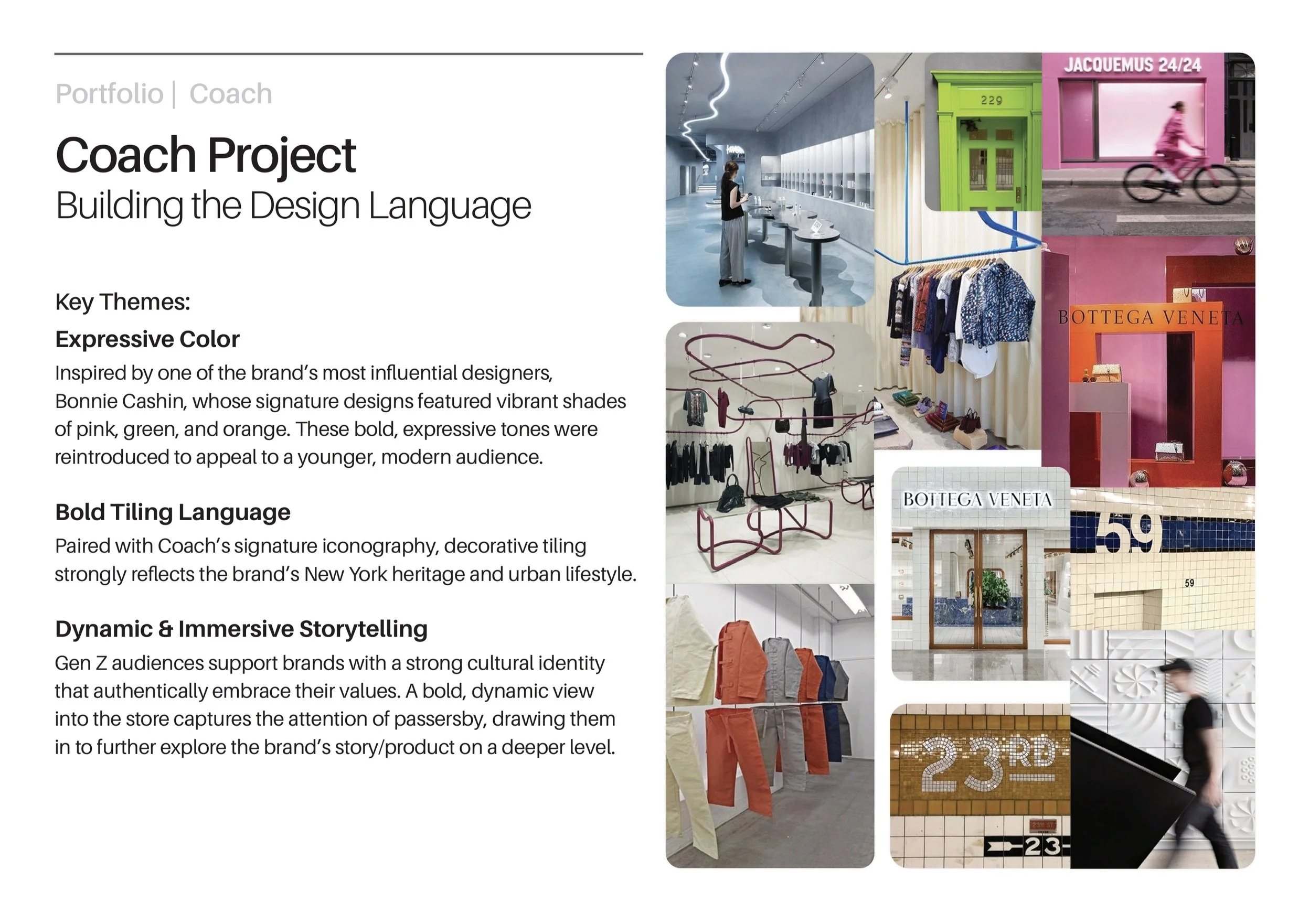 The main outcome of this project was to design a new façade and store layout for Coach’s Garden State Plaza location, refreshing the brand’s identity to appeal to a modern, trendy Gen Z audience.